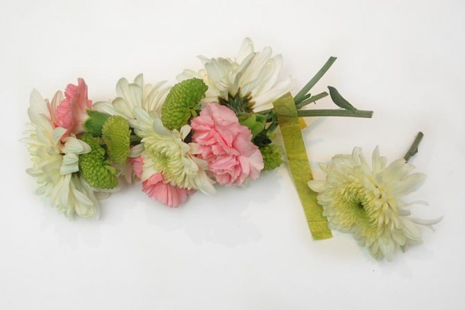 Для создания такого украшения сначала надо определиться с выбором цветов. У вас наверняка есть любимые. Смело выбирайте их. Подумайте о размещении бутонов — каждый цветок надо разместить так, чтобы он смотрелся максимально эффектно.