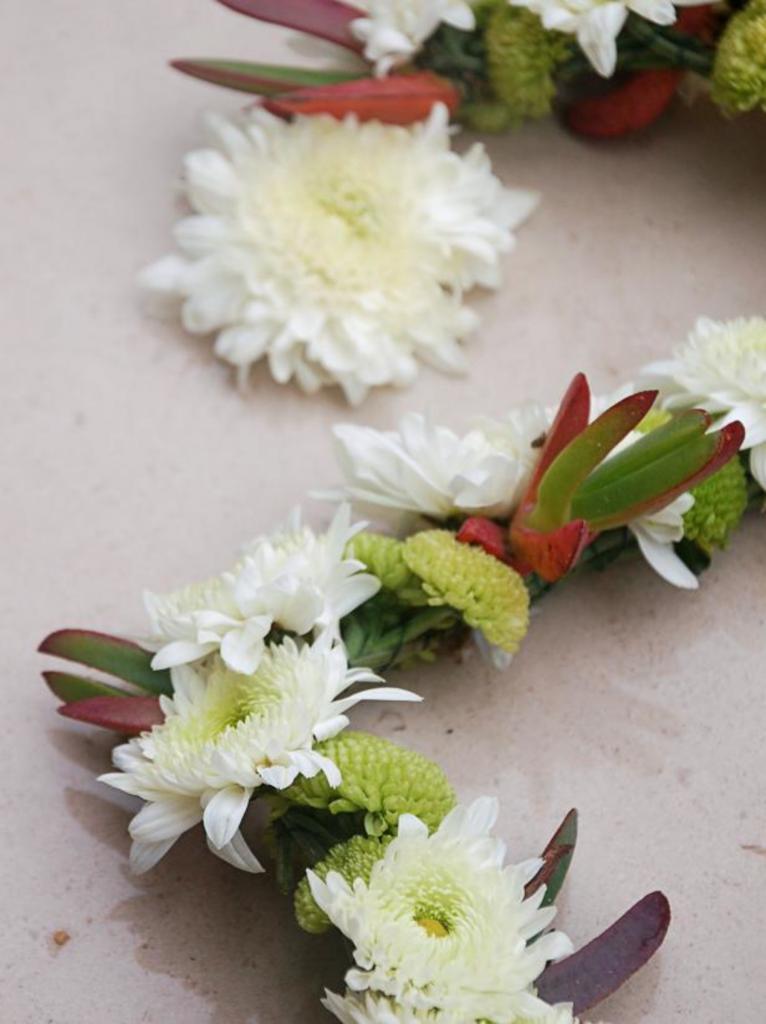 Первая гирлянда создана только из цветов. Мы выбрали зеленые листья и белые хризантемы вместе с розовыми гвоздиками для гирлянды, которая будет выглядеть особенно нежной и эффектной.