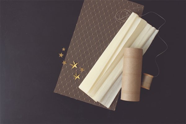 Разрежьте кружевную ткань и гофрированную бумагу на прямоугольники. Самая короткая часть прямоугольника должна быть достаточно длинной, чтобы обернуть цилиндр.