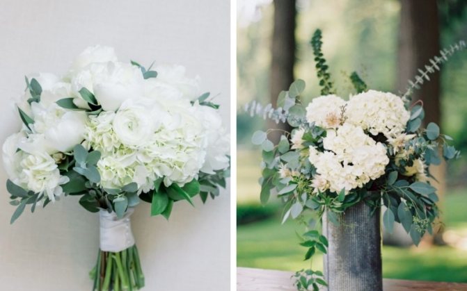 Широкие полукруглые резные листья цветка практически не требуют дополнительного украшения зеленью в качестве декора, однако для однотонных каскадных композиций с бело-зеленоватой гортензией можно использовать эвкалипт или салал.