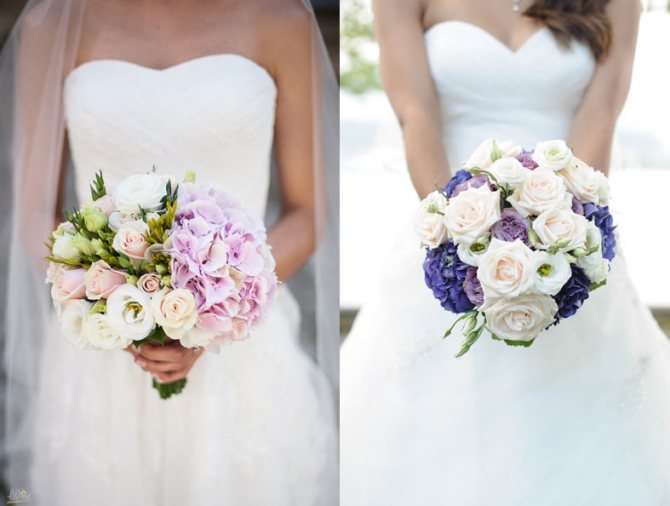 Флористы, исходя из желаний, могут создать букетики из гортензий, подходящий по стилю и к внешности невесты. Монобукет белого или голубого оттенка для невесты будет выглядеть изысканно.