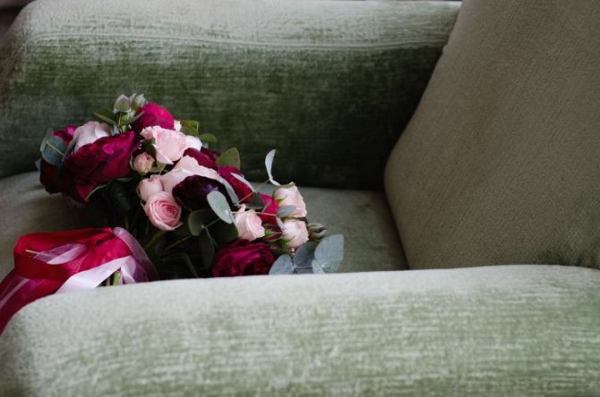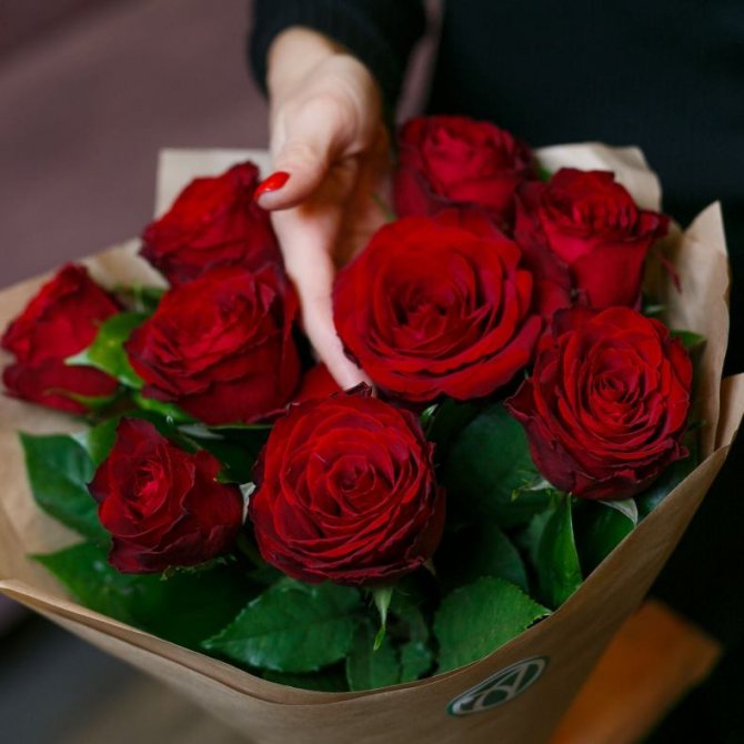 4. Приятным дополнением к презенту супруге будет букет бордовых роз, перевязанный алой лентой в виде пышного банта.