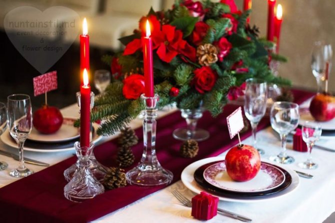 С помощью дизайна создайте праздничную атмосферу. Главный декоративный элемент – гранаты. Они прекрасно сочетаются с красивой посудой в красном цвете, а также скатертью и салфетками этого же тона.