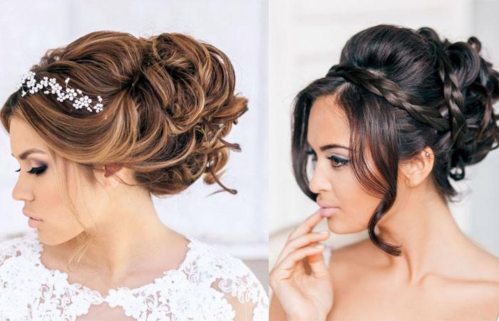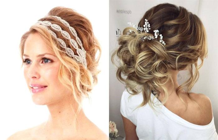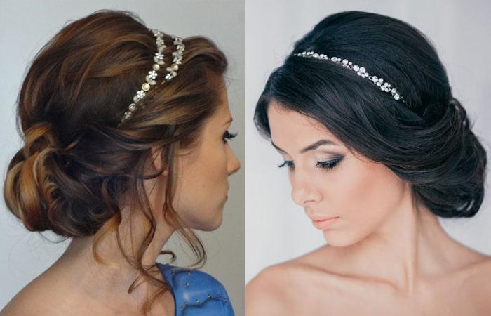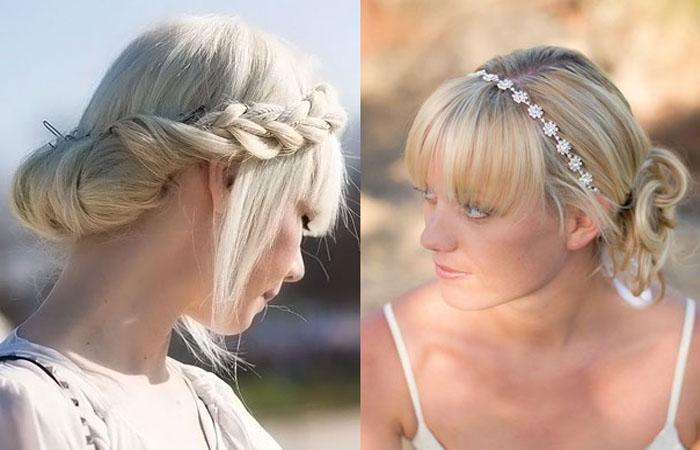 Если волосы недостаточно длинные, можно не оставлять их распущенными. Соберите их в элегантный пучок, дополните его диадемой, ободком или красивой заколкой, при желании завершите образ фатой. Обязательно сделайте локоны, чтобы прическа получилась праздничной. Вечерняя и свадебная укладка сочетается с челкой.