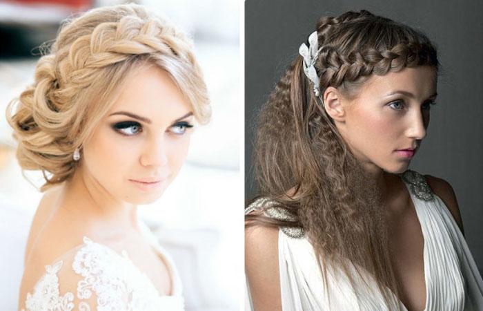 - Греческая коса. Другое название — «ободок». Заплетается по краю волос в виде полукруга или короны, часто проходит вдоль линии лба. Сзади локоны можно собрать в узел, хвост или оставить распущенными. Коса имеет несколько разновидностей.