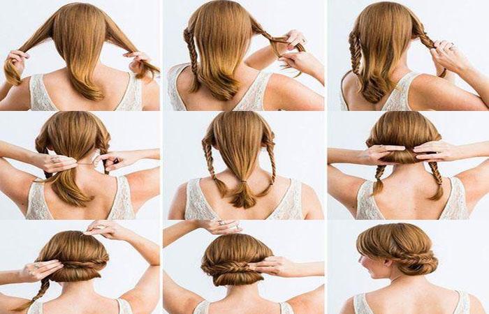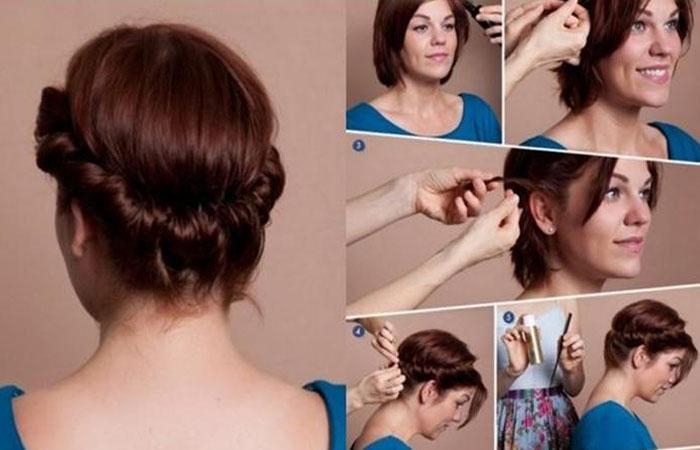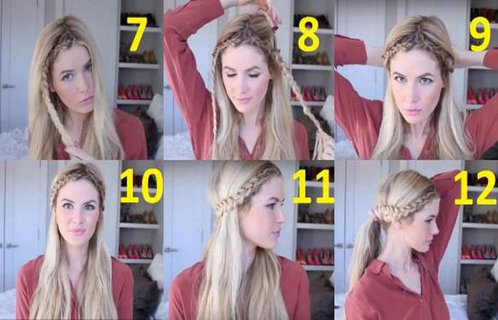- Дойдя до макушки, начешите волосы, затем подкрутите их и уложите в косу.