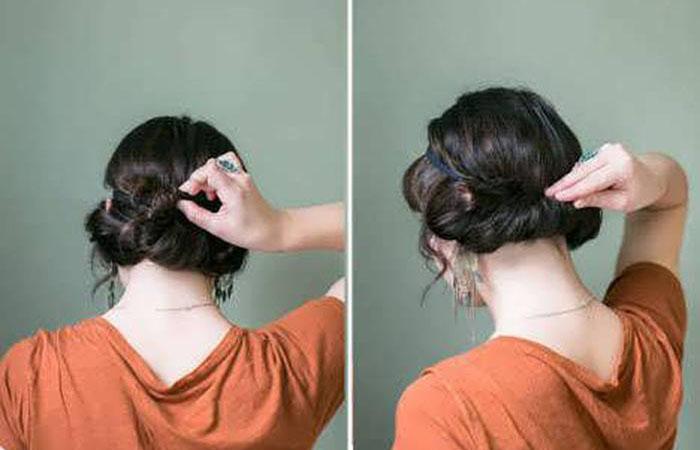 - Закалывайте невидимки поверх свободной широкой части волос на затылке. У вас должна получиться объемная «шапочка» из начесанных прядей.