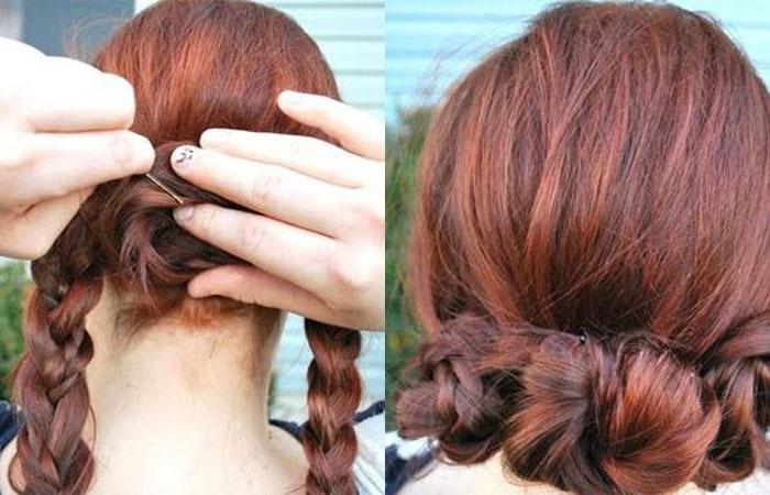 - Кончик косы замаскируйте в месте, с которого начинали плетение. В этом помогут шпильки или невидимки.