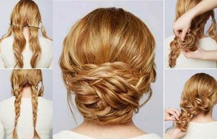 - Накрутите из свободных волос локоны, переплетите их между собой и закрепите шпилькой. Распушите.