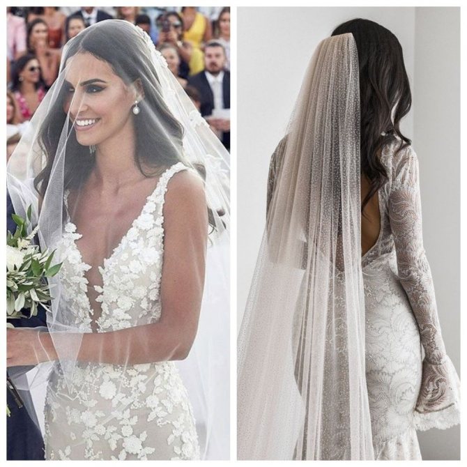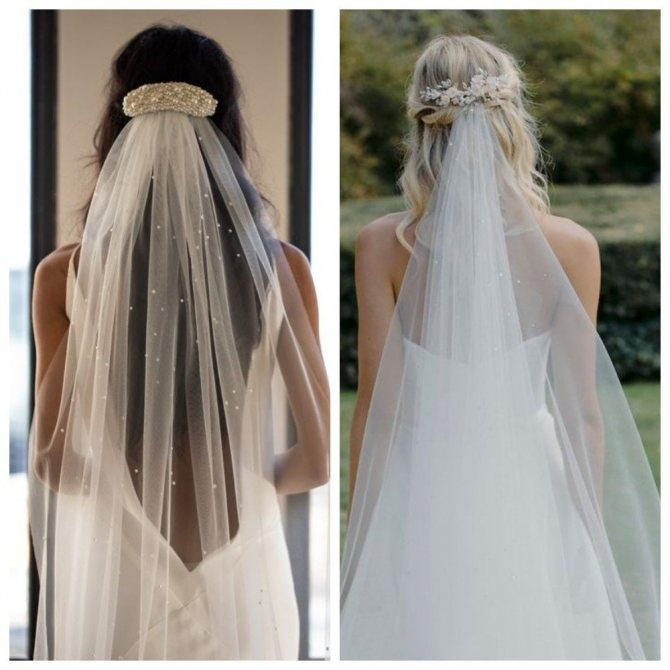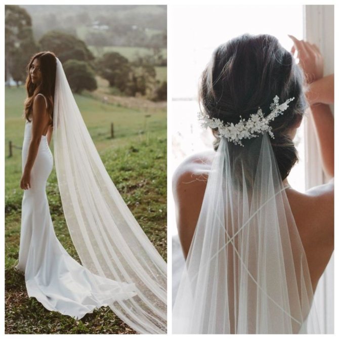 Такая подходит для всех типов волос: коротких, средних, длинных. Длинная фата гармонично сочетается с любой свадебной прической: