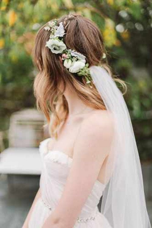 2) Поверх фаты можно надеть венок (он может быть из цветов: живых или искусственных, других материалов) или обруч, а можно приделать фату к ним сзади.