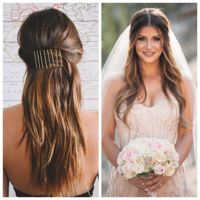 Современные мастера вместо начеса или косички делают каркас под фату из невидимок. Этот способ подходит и для локонов, и для прямых волос.