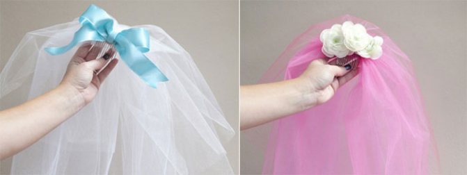 Для изготовления головного убора для девичника используют такие геометрические фигуры, как прямоугольник или ромб. Работу выполняют по тому же поэтапному плану, что и для подвенечного атрибута. Для украшения используют шелковые ленты, стразы, бусы, цветы. В завершение не остается ничего другого, как пришить фату к выбранному креплению.