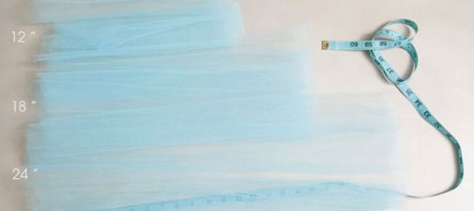 - Чтобы сделать фату, разрезаем по длине фатин на три отреза по 60, 45 и 30 см.