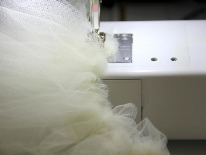 Как только нужная комбинация интенсивности сборки будет найдена – ее необходимо зафиксировать. Сделать это очень просто, собранную фату нужно прострочить на швейной машинке, используя самый обыкновенный шов с не особенно мелким шагом.