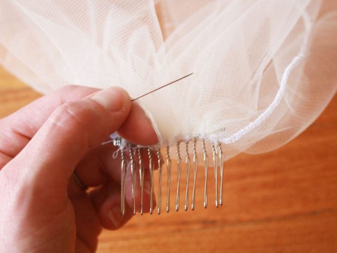 Гребень прикрепляется к тому месту, где собирается ткань. Тюль пришивается именно к лицевой стороне гребня. Зубья должны быть направлены вверх. Так делать удобнее и правильнее всего.