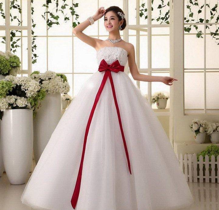 | Красный | Красный пояс — символ любви и страсти. Он делает образ невесты смелым и эффектным. Короткое подвенечное платье удачно дополнит узкая красная лента. Для обрамления пышного наряда рекомендуется использовать широкий алый ремешок. Будет красиво дополнить его объемными цветами или завязывающимся бантом. | |