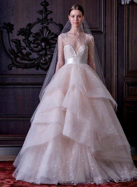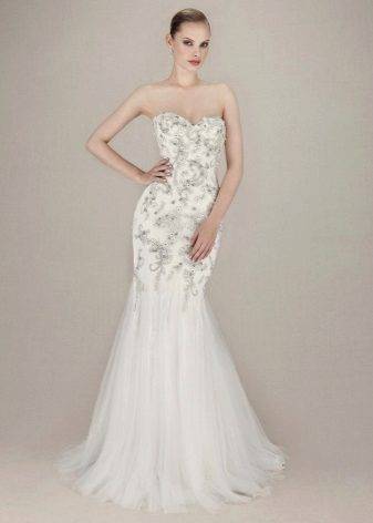 Среди множества образцов выделяются изысканные, элегантные платья модных брендов Marville, Dior, Angelo Galasso, которые превращают женщину в настоящую королеву. Блестящие, яркие образцы придают обаяние, роскошь и загадочность женскому образу. Неповторимое пышное свадебное платье со стразами на корсете от модельера Badgley Mischka покоряет красотой и роскошью. Для создания такого шедевра используются дорогие материалы, ручная вышивка и натуральные камни. Свадебный ансамбль, включающий белоснежное платье, белую лакированную обувь на высоком каблуке и прическу в сопровождении стразов, выглядит божественно и превращает невесту в сказочную принцессу.