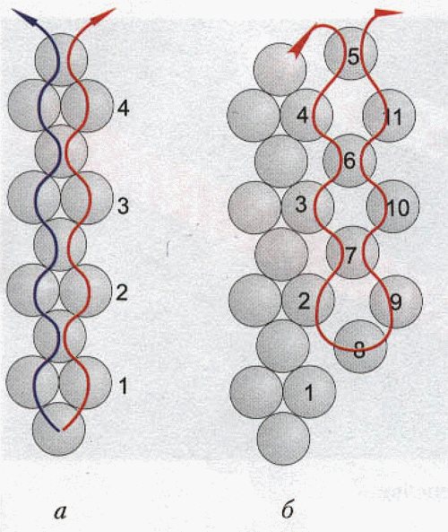 - вперед иголкой – простой способ пришивания бисера. Вышитая линия получается ровной. Но из-за небольшого расстояния друг от друга линия прерывистая;