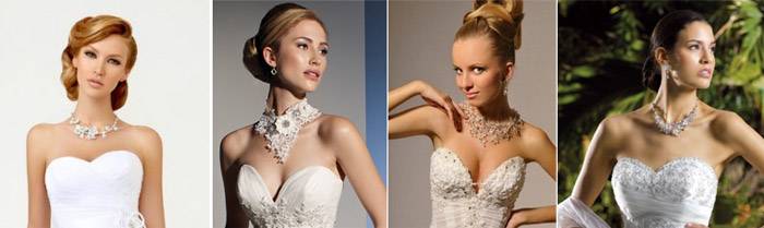 Если на свадебном платье вырез в форме сердца, девушка может подобрать любой тип украшения. Это универсальный фасон, который будет прекрасно сочетаться как с роскошным объемным колье, так и со скромной подвеской. Однако, если декольте платья украшено камнями, стразами или бусинами, его обладательнице стоит отдать предпочтение изящной цепочке с элегантным кулоном. Как уже отмечалось выше, основным принципом, которым следует руководствоваться при подборе аксессуаров, является чувство меры.