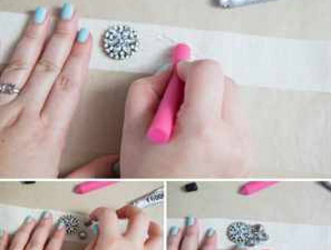 3.Нужно наносить клей на ленту и детали с помощью палочки из силикона.