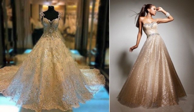 Особенно волшебно смотрится глиттер, он так же идет градиентом или редкими вкраплениями. Чаще всего им покрывают полупрозрачные ткани, которые усиливают отражение, а тем самым и блеск.