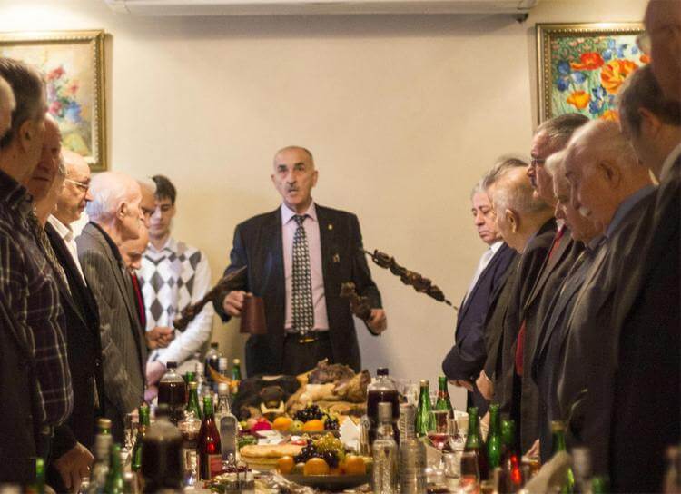 Особое место среди всей череды обрядов занимает, конечно же, застолье. Когда все гости в сборе, во главе стола сидят жених с невестой, принято говорить тосты и произносить традиционные кавказские поздравления на свадьбу. Самые главные слова и наставления звучат, прежде всего, от родителей с обеих сторон. Хотя и в мудрых поучениях на подобных гуляньях присутствует доля юмора. Родители, как правило, желают молодоженам постигнуть счастье пребывания вместе, запастить силами и терпением пронести через всю жизнь свою любовь и претворить ее в собственных детях, увидеть внуков и сполна познать истинную мудрость. Также тосты подобного содержания говорят старшие родственники. Особое место за огромным столом предоставляется бабушкам и дедушкам, а возможно, и их родителям. Ведь именно от них идет род, который и продолжится в будущих детях.