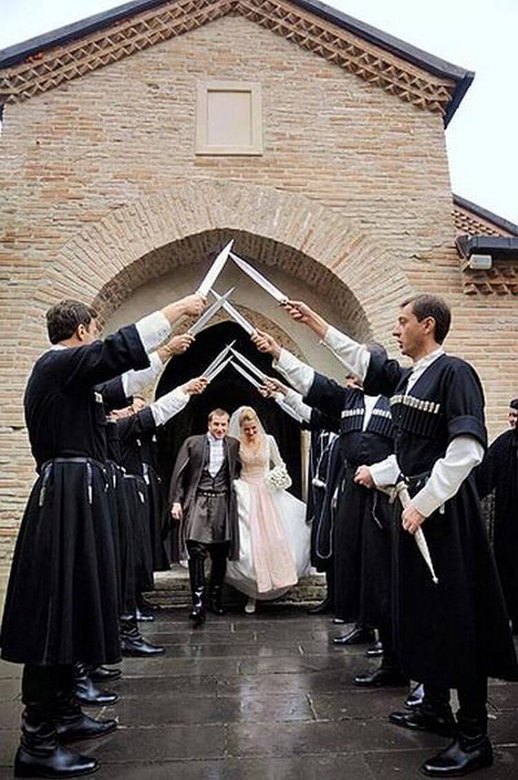 После венчания молодожены проходят под кинжалами, поднятыми над их головой. Считается, что таким образом они получат защиту от бед.