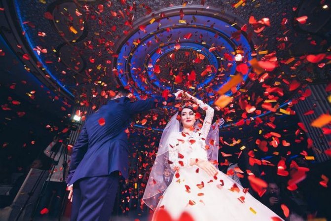 Гости посыпают выходящих молодожёнов рисом (для скорого рождения детей), конфетами (для сладкой жизни), монетками (для богатства) и лепестками роз (для красивой, романтичной совместной жизни).