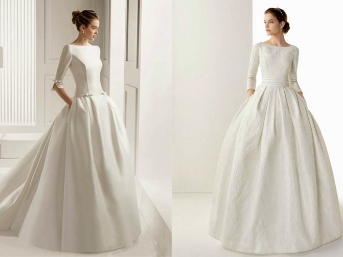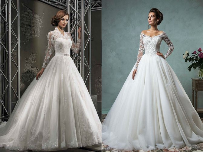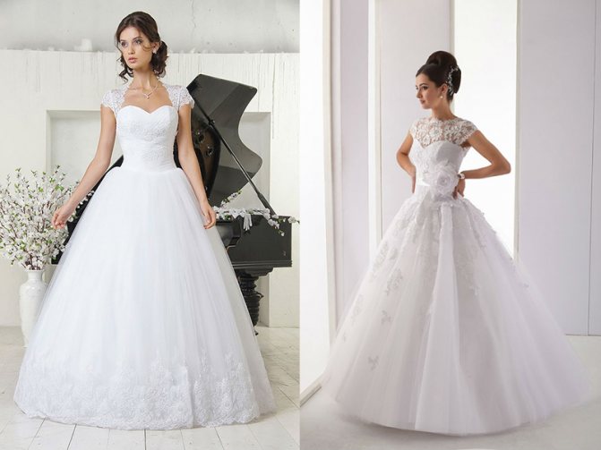 Фасон каждая невеста сможет подобрать под себя, так как классические платья могут быть как пышными, так и нет. Выбор делается исходя из фигуры девушки, полные виновницы торжества в пышных платьях могут выглядеть грузно.
