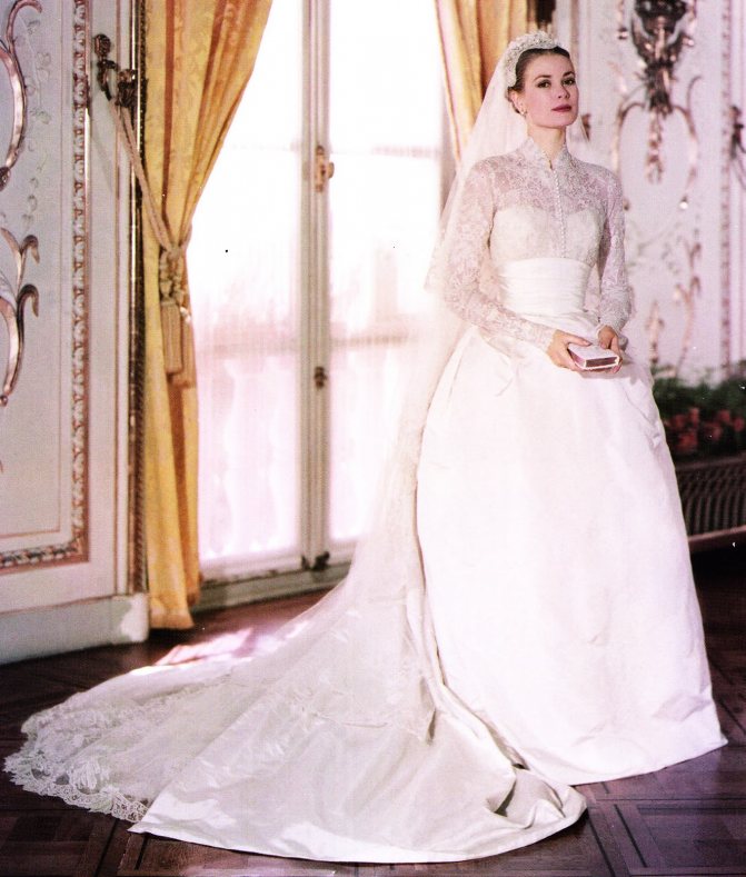 Грейс Келли получила свою свадебное платье в подарок от студии Metro-Goldwyn-Mayer. Сшитое из шёлковой тафты и кружева, украшенного жемчугом, оно и в наши дни считается эталоном стиля.