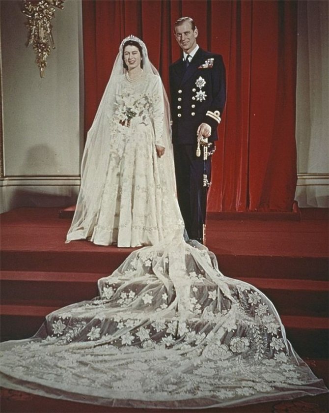 Будущая королева Елизавета II вышла замуж в 1947 году. Это было сложное послевоенное время экономии и карточной системы. Со всего мира девушки присылали ей талоны для пошива достойного платья. Изготовили наряд из атлас-дюшеса кремового цвета. Верх и подол симметрично расшили цветами из жемчужин. Дополняла одеяние кружевная фата.