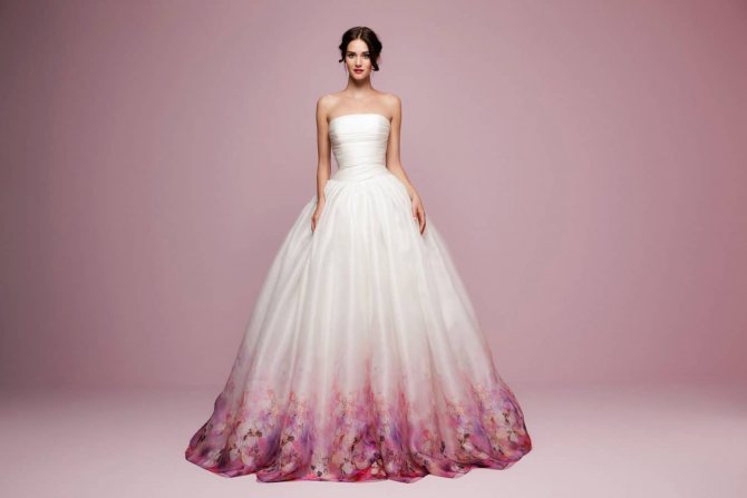Среди многочисленных фото красивых свадебных платьев особое внимание привлекает наряд с многослойной, необъятной фатиновой юбкой. Благодаря применению цветочной аппликации он выглядит невероятно романтично. Особый шар ему придает окантовка контрастного цвета.