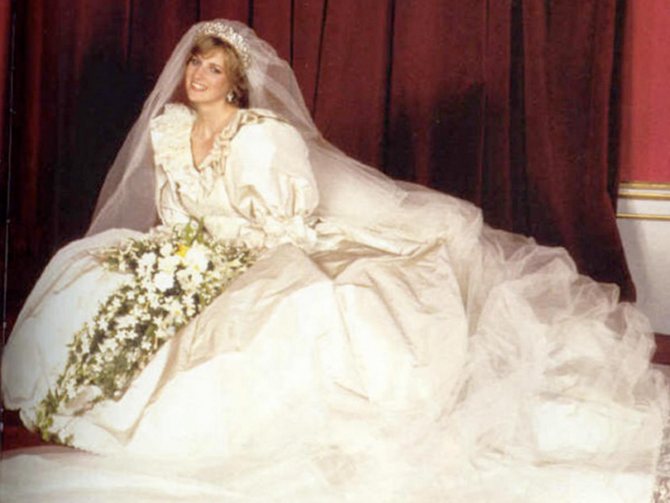 Платье принцессы Дианы пышное, роскошное и сказочное. Оно было пошито из шелковой тафты цвета слоновой кости, украшено жемчужинами и старинным кружевом ручной работы. Отличительной чертой стал шлейф длинной почти 8-метров. Сейчас оно конечно смотрится уже не так актуально, но свой след в истории оно несомненно оставило.