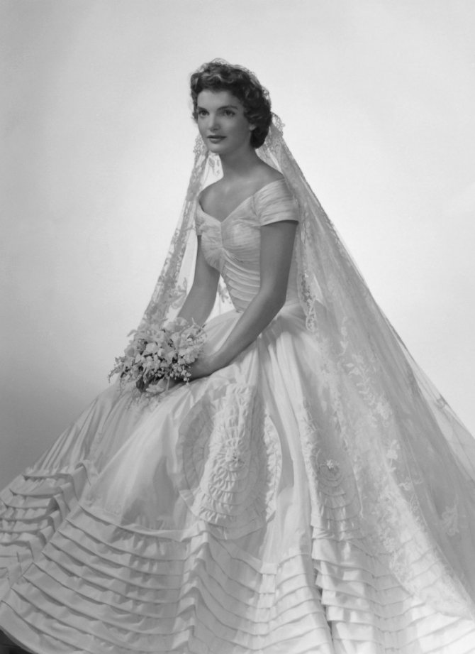 Платье Жаклин Кеннеди было сшито по моде своего времени с пышной юбкой и глубоким декольте. Ткань наряда — шёлковая тафта цвета айвори. Фата, украшавшая голову невесты, принадлежала её бабушке.