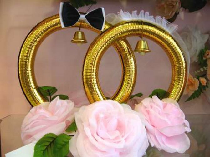 Из гибких шлангов делаются три кольца: два соединяются между собой, к третьему они крепятся. Но сначала их все нужно обмотать фольгой или лентой, затем уже хорошенько скрепить скотчем. Готовые кольца крепко-накрепко пришиваются к основанию, чтобы не упали в дороге. Основание драпируется тканью или цветами, на сами кольца можно повесить колокольчики.