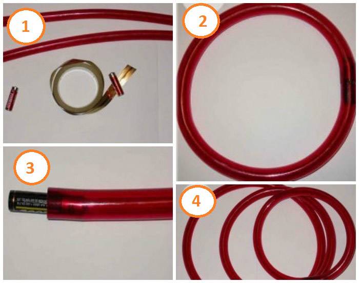 - Вставьте в каждую трубу с одной стороны по пальчиковой батарейке, чтобы она торчала на половину, потом соедините со свободной стороной трубы. Проверьте, крепко ли держится кольцо. Если есть сомнения на счет надежности крепления, дополнительно зафиксируйте место стыка скотчем или суперклеем.