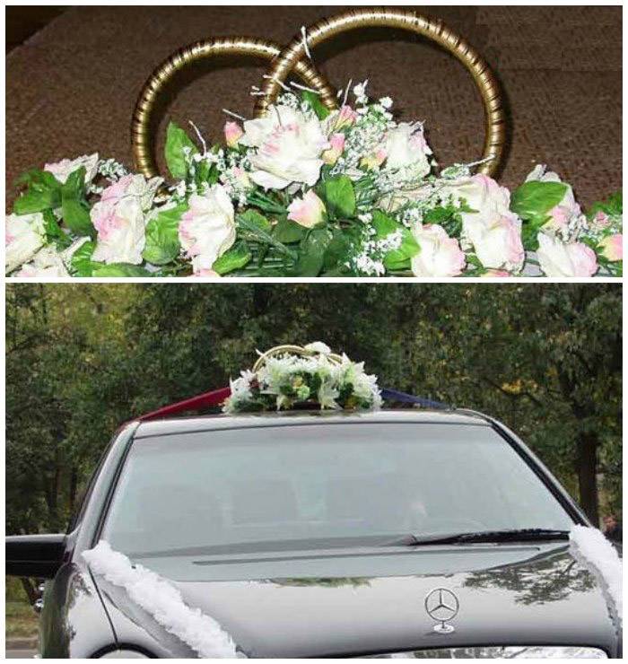 Одним из самых важных элементов декора, используемых при оформлении свадебного кортежа, являются свадебные кольца на машину, которые крепят на крыше автомобиля или на его капоте. Сделаны они могут быть из металла или дерева, украшены цветами или лентами.