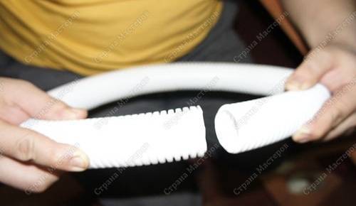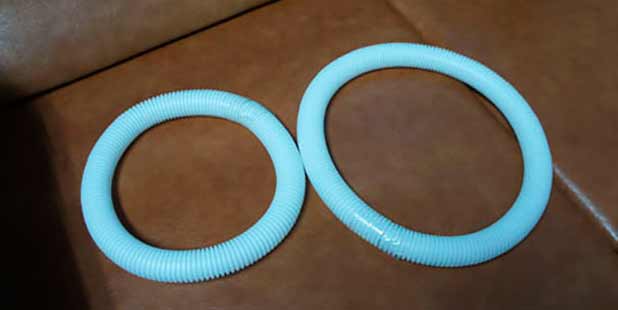 - Гофротрубу разрезают на две части разной длины, чтобы получить окружности большего и меньшего диаметра. Отрезки соединяют в кольца и закрепляют в месте соединения липкой лентой.