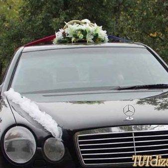 Фатин, как правило, распределяют асимметрично, поэтому небольшой букет в самом узком месте ткани прекрасно украсит машину. На радиаторную решетку можно посадить куклу, или прикрепить сердце, сделанное из ткани.