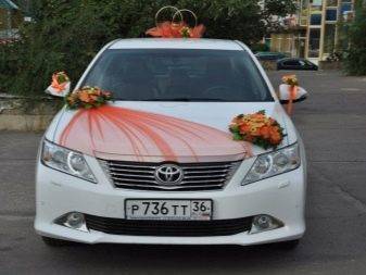 Самый простой и недорогой способ украсить машину – купить несколько разноцветных атласных лент и закрепить их на капоте. Это можно сделать по-разному: