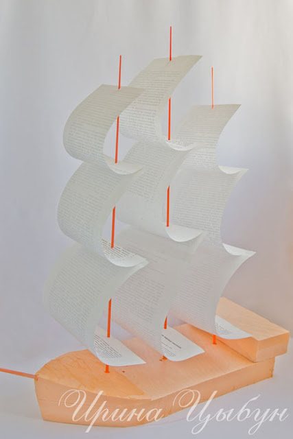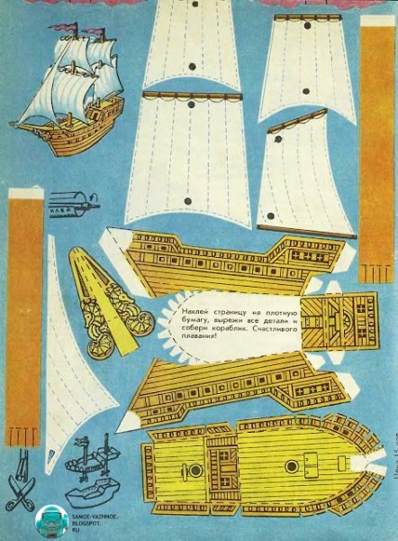 У данного корабля нижний парус — лист формата А4, на средней мачте — чуть больше.