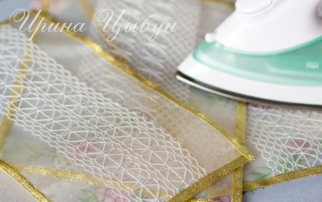 Следующим этапом изготавливаются паруса из флористической сетки. Обычно делают две или три мачты, причем в нижней части парус совпадает по ширине с кораблем, а кверху немного сужается. На швейной машинке можно прикрепить к сетке тонкие атласные ленточки, а также прошить заготовки в трех местах по горизонтали. Это создаст впечатление, что паруса натянуты ветром. Сквозь середину продеваются деревянные шпажки, и получившиеся мачты закрепляются в основе.
