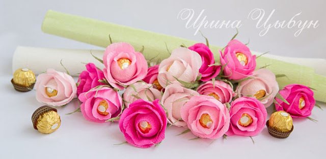 После того как вы определились с конфетами, их нужно будет завернуть в лепестки, которые вырезаются из гофрированной бумаги. Лепестками оборачиваем конфеты и приклеиваем края скотчем или клеем таким образом, чтобы оставить внизу два-три сантиметра сладкого изделия. К нижней части прикрепляем стебель. Один сладкий цветок готов!