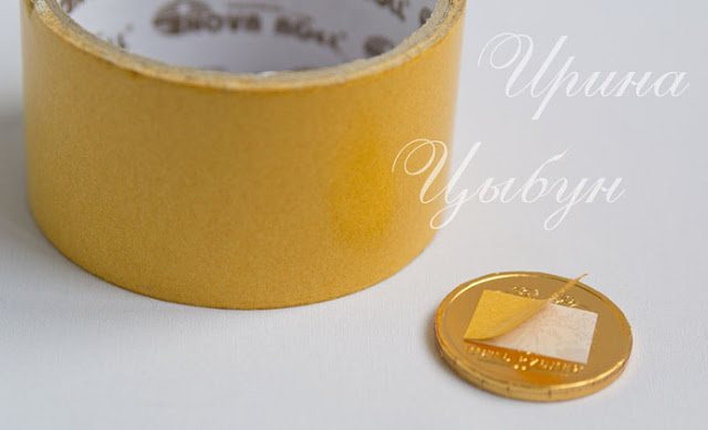 На скотч приклейте кусочек бумаги, а затем горячим клеем посадите медаль в нужное место.