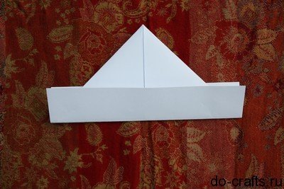 Полоску бумаги под получившимся углом надо загнуть наверх, затем перевернуть основу будущего корабля и сделать то же самое.