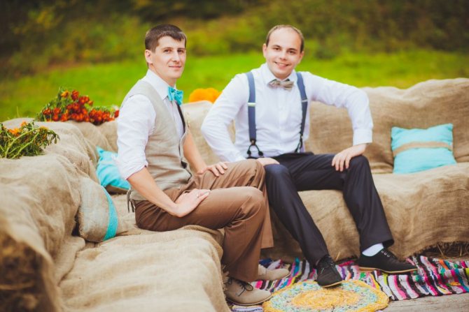 У всех свидетелей одинаковые бабочки либо галстуки, а у жениха расцветка аксессуара отличается. Возможен вариант, что у жениха галстук, а у друзей бабочки, но все аксессуары выполнены из одинаковой ткани. При таком подходе получаются очень красивые фотографии, которые будут храниться виновниками торжества всю жизнь и с гордостью показываться детям и внукам.