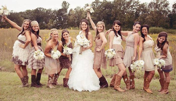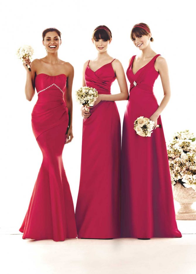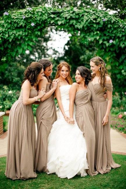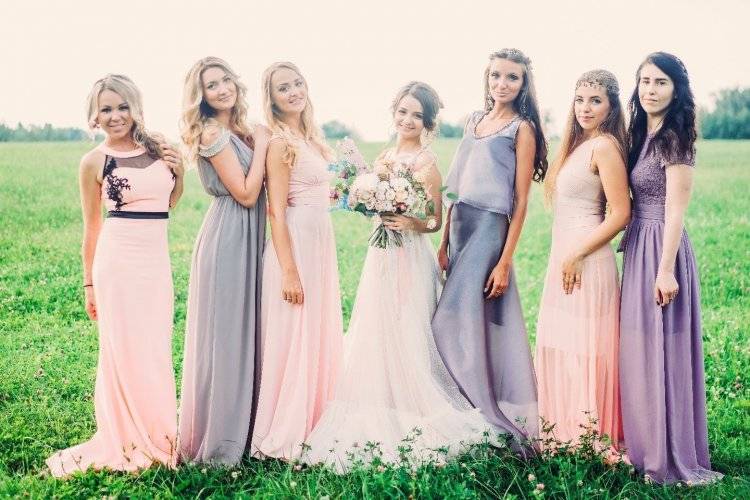 Тогда на фотографиях все будут в нарядах одного цвета, но разных фасонов. Каждая из девушек сможет подобрать себе модель, подчеркивающую достоинства её фигуры и скрывающую недостатки. Поскольку, блондинкам, шатенкам и брюнеткам подходят разные оттенки, то возможен вариант пошива платьев из одинаковой по фактуре ткани, но разных оттенков одного цвета.