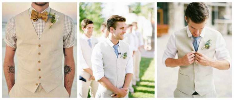 Если свадьба будет проходить летом в жаркую погоду, можно обойтись без пиджака, но рубашка обязательна. Ее можно дополнить бабочкой. От галстука лучше отказаться, без пиджака образ будет выглядеть неполным.