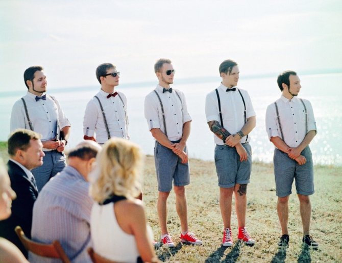 Особая роль отводится аксессуарам. Именно, за счет одинакового выбора стили объединяются. К примеру, жених одевает бабочку, и друзья останавливают выбор на бабочке, аналогично с галстуками.